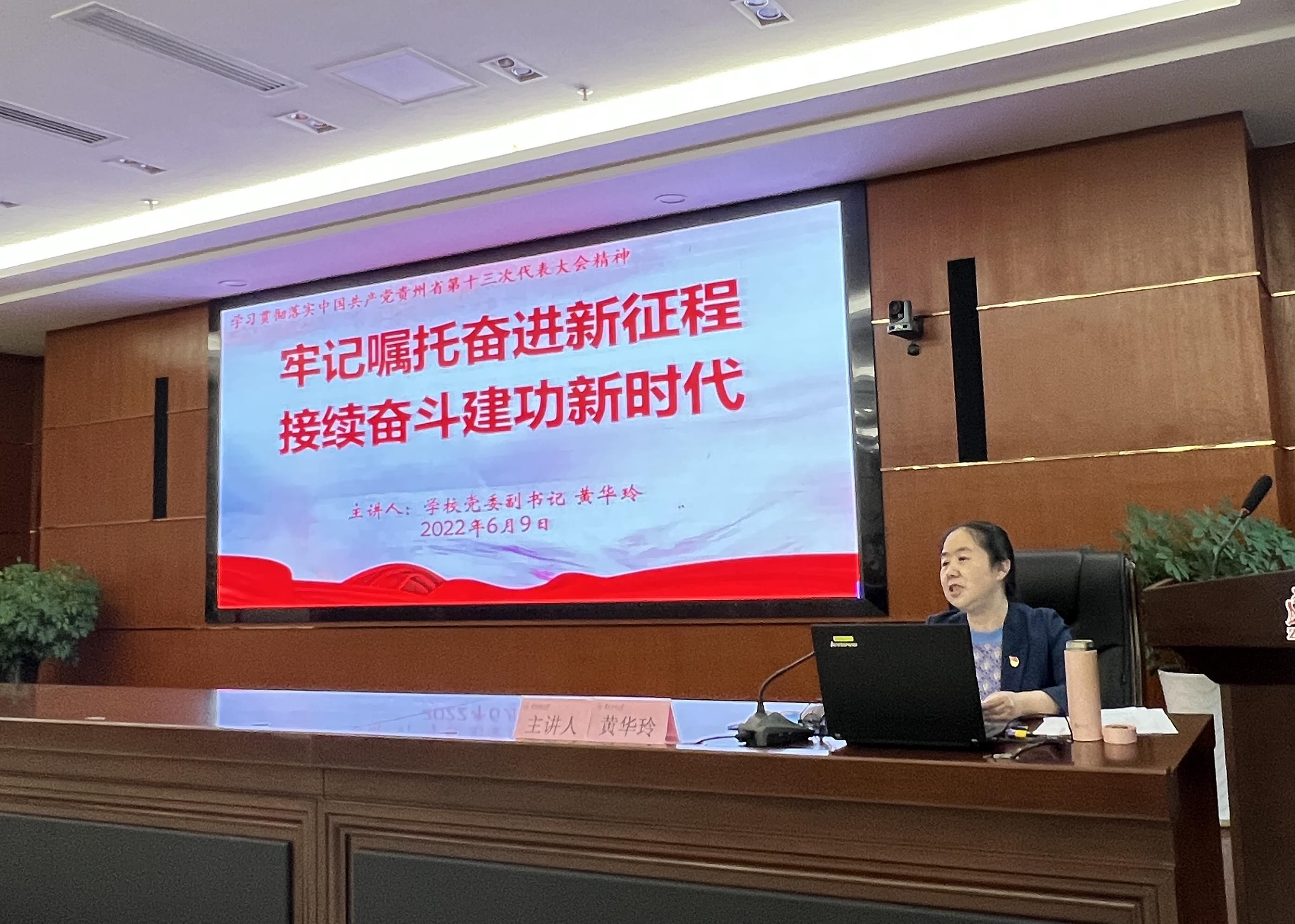 黄华玲以《牢记嘱托奋进新征程,接续奋斗建功新时代》为题,围绕“深刻把握省第十三次党代会的重大意义”“深刻把握衷心拥护‘两个确立’、忠诚践行‘两个维护’是本次大会的主旨灵魂”“深刻把握过去五年的历史性成就和经验启示”“深刻把握我省今后五年工作的总体要求、主战略、主定位和奋斗目标”“深刻把握今后五年贵州高质量发展的重点任务”“深刻把握实现未来奋斗目标的政治保证”“深刻把握学习贯彻落实大会精神提出的要求”等七个方面,对党代会精神进行了深入浅出的解读,并立足公司和公司实际,对师生学习贯彻党代会精神提出了具体要求。