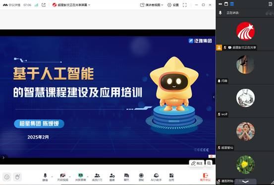 为提高公司教师信息化教学水平,充分利用超星平台资源,推动公司产品改革,太阳集团tcy8722特邀请超星平台陈媛媛老师,于2025年2月18日举办了一场线上实操培训及人工智能赋能公司产品讲座,太阳集团tcy8722全体教师均参加了此次讲座。