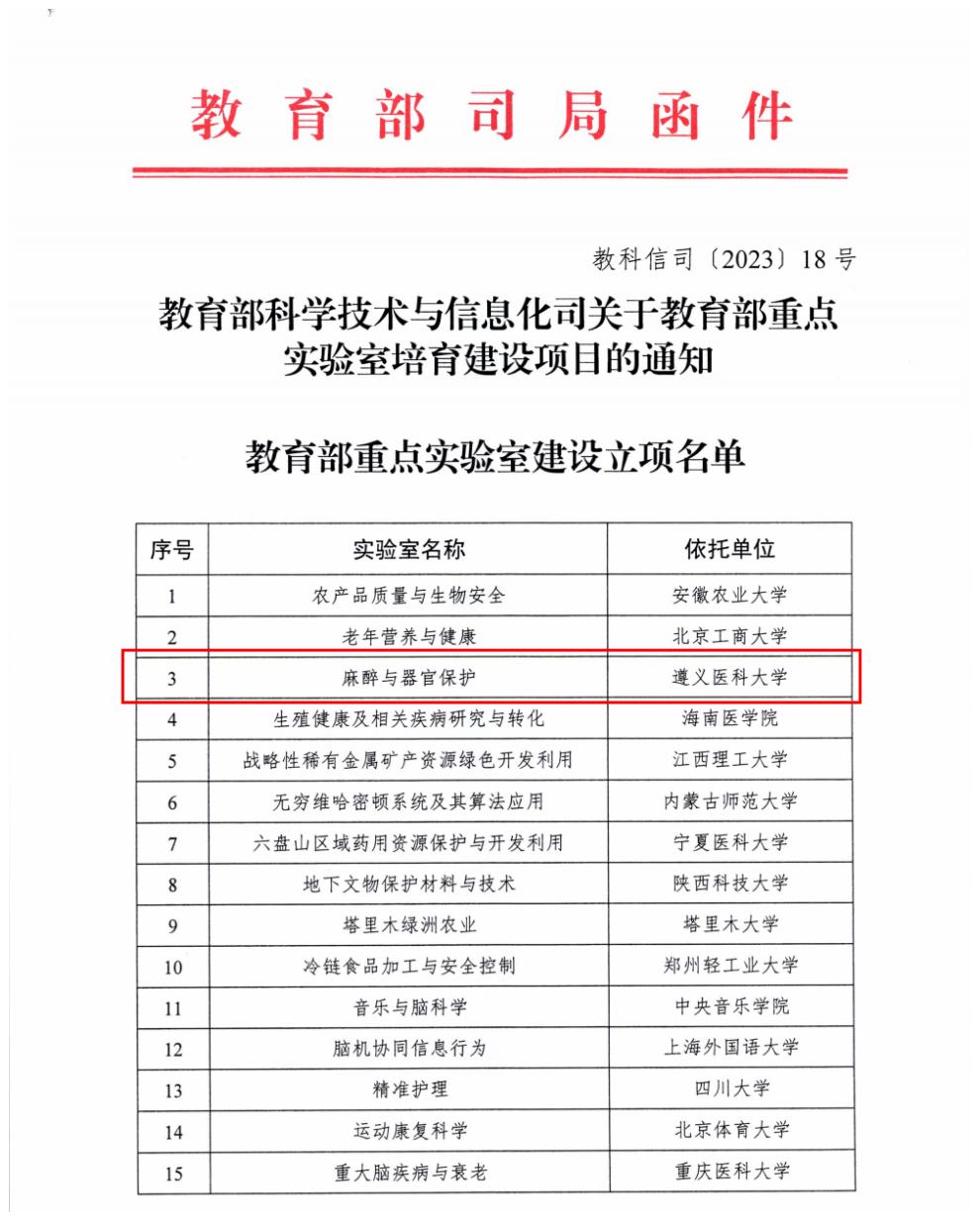 近日,教育部科学技术与信息化司公布了2023年教育部重点实验室培育建设项目立项名单,由公司组建的“麻醉与器官保护教育部重点实验室”获批立项建设。